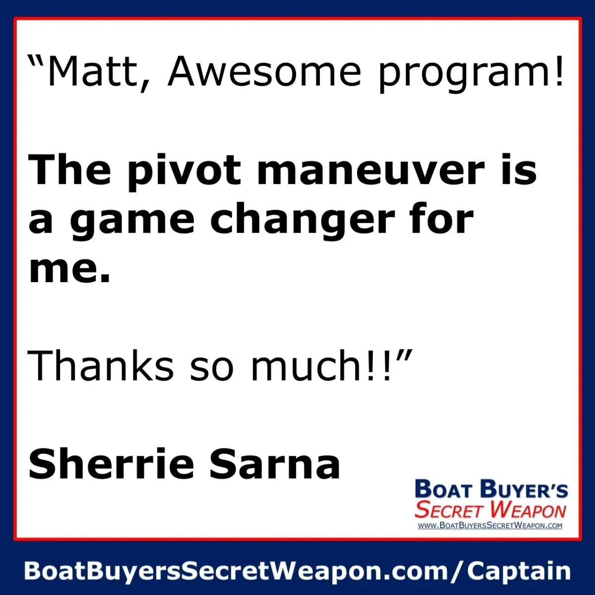 "I must admit that all these docking lessons definitely helped out on Memorial Day while I was docking my brand new Avalon. I have learned so much from these videos! Thanks so much Capt. Matt!"